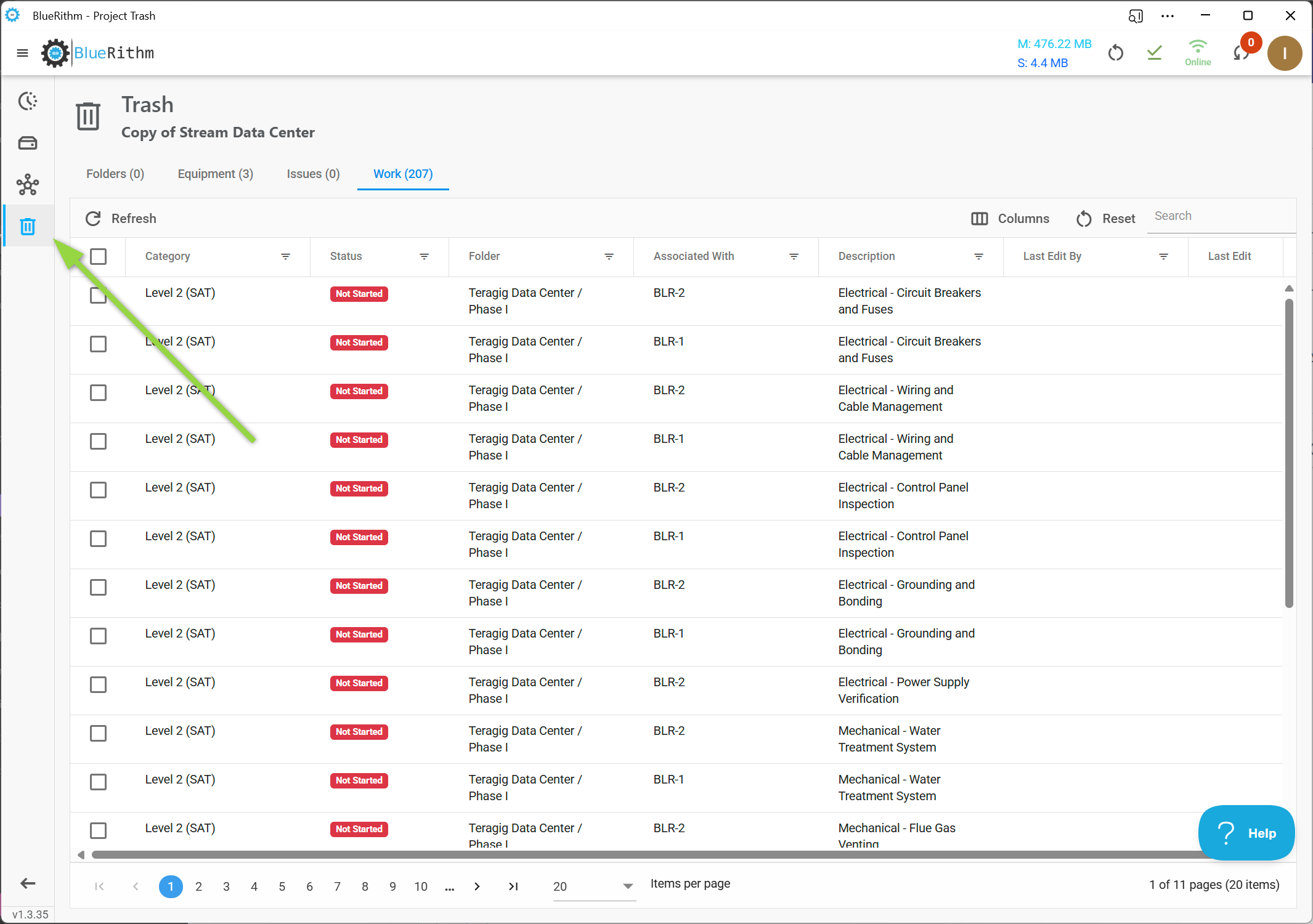 In the Bluerithm app, you can recover most deleted items using the Trash page. The Trash page allows you to filter, sort, and search for specific items to restore.
