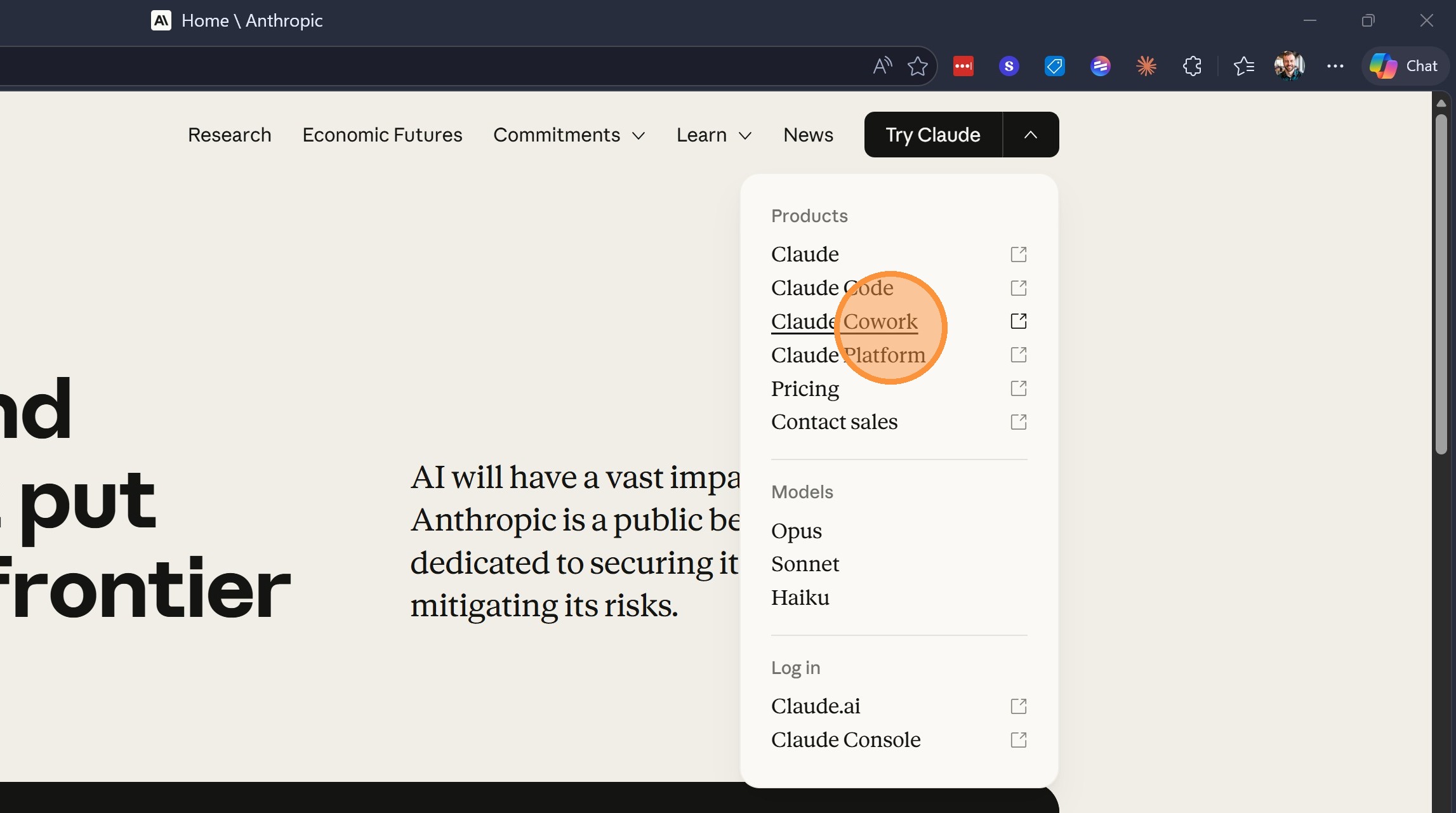 Open your browser and navigate to anthropic.com. From there, locate the Claude Cowork download page.