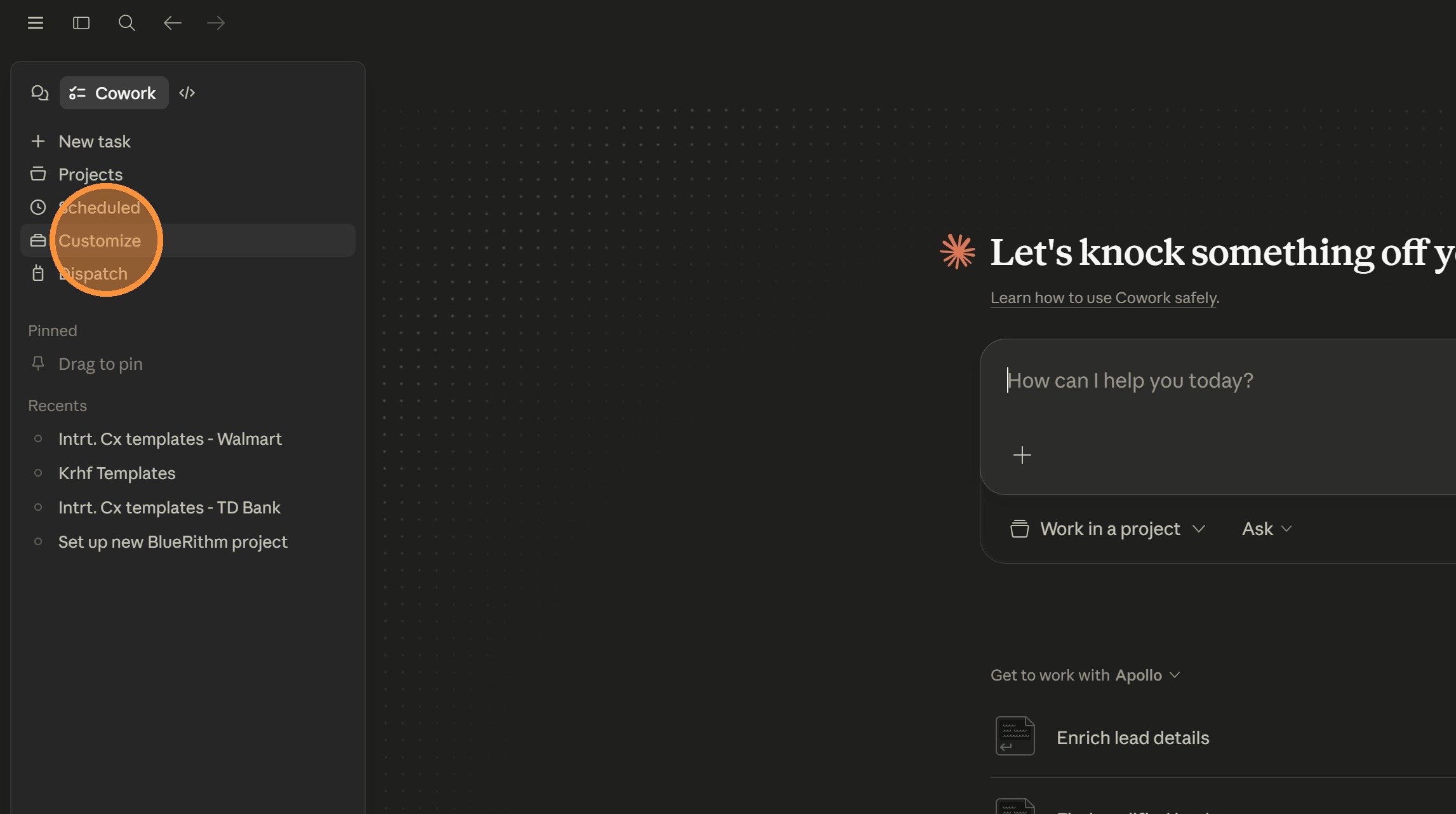 Launch the Claude desktop app and navigate to the Cowork tab (note: this is separate from the Chat and Code tabs). Then open the Customize section.