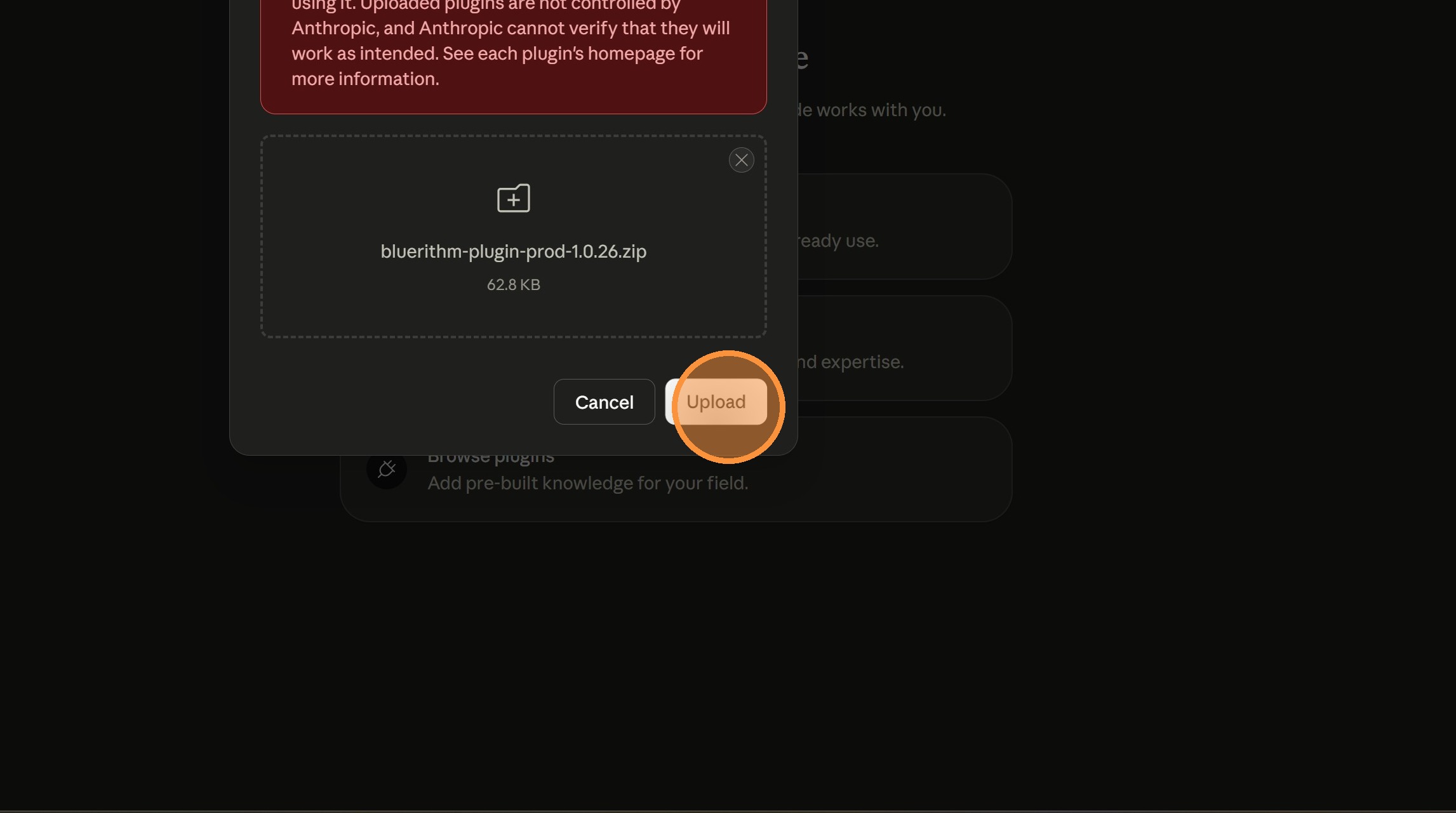 Select the Bluerithm plugin .zip file, drop it into the upload dialog, and click Upload.