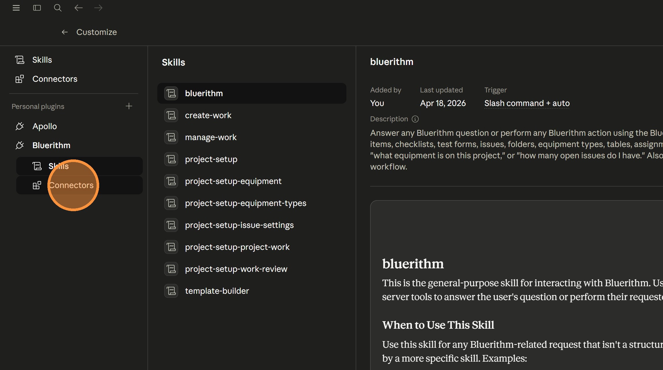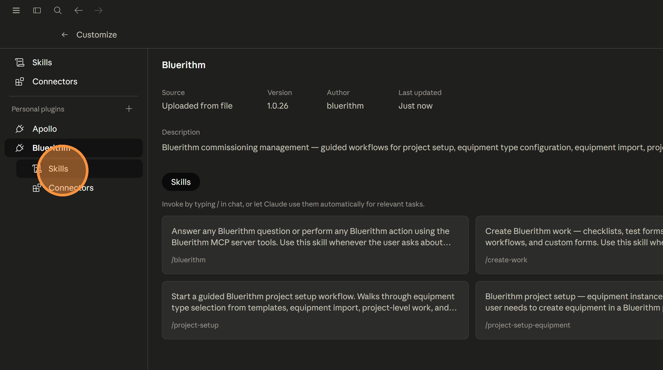 Open the plugin to see the list of skills it provides. Skills are the instructions that tell Cowork how to interact with Bluerithm for specific tasks.