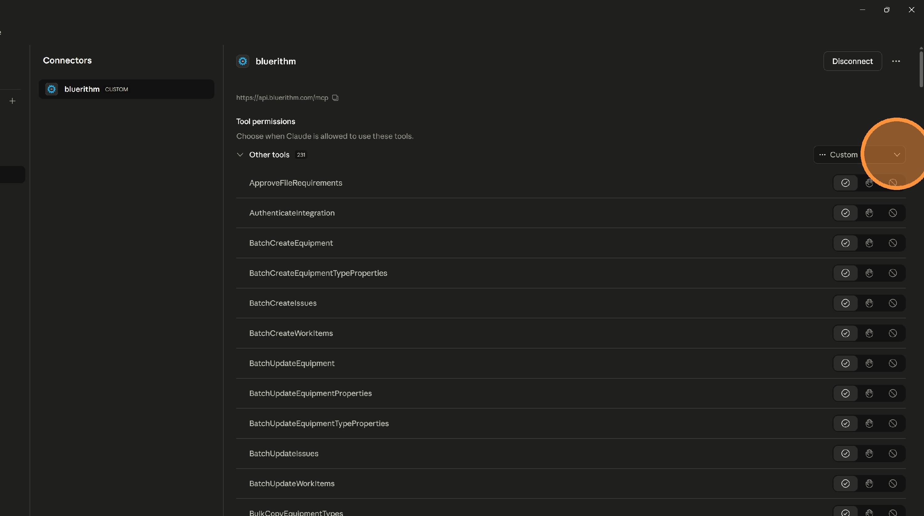 Once authenticated, you’ll return to Cowork and see the full list of tools — the backend connection points Cowork can use in Bluerithm. At the time of this writing there are over 200 tools available. It’s worth reviewing the default permission for each.