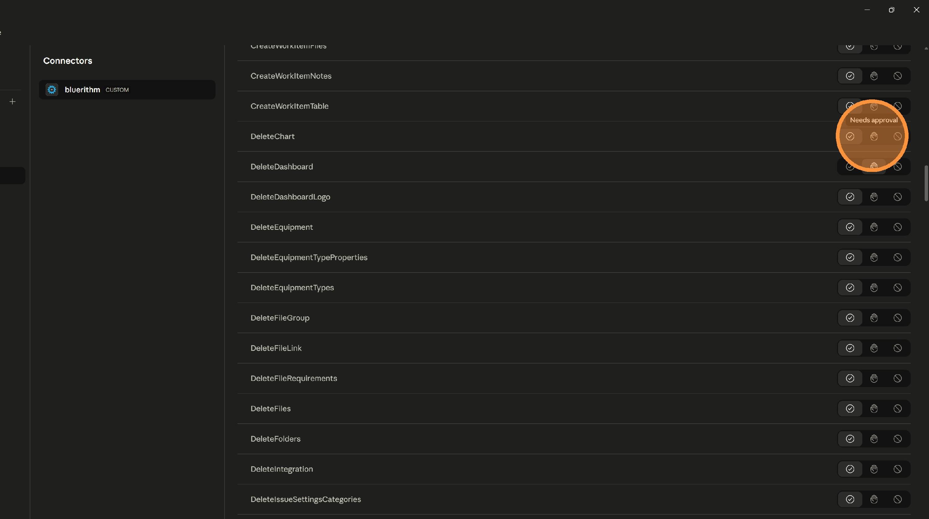 Scroll down to the Delete tools. These allow Cowork to delete data from Bluerithm. We recommend setting these to Needs approval wherever you believe accidental deletion could be risky. With this setting, Cowork will ask for your permission before running any delete operation.