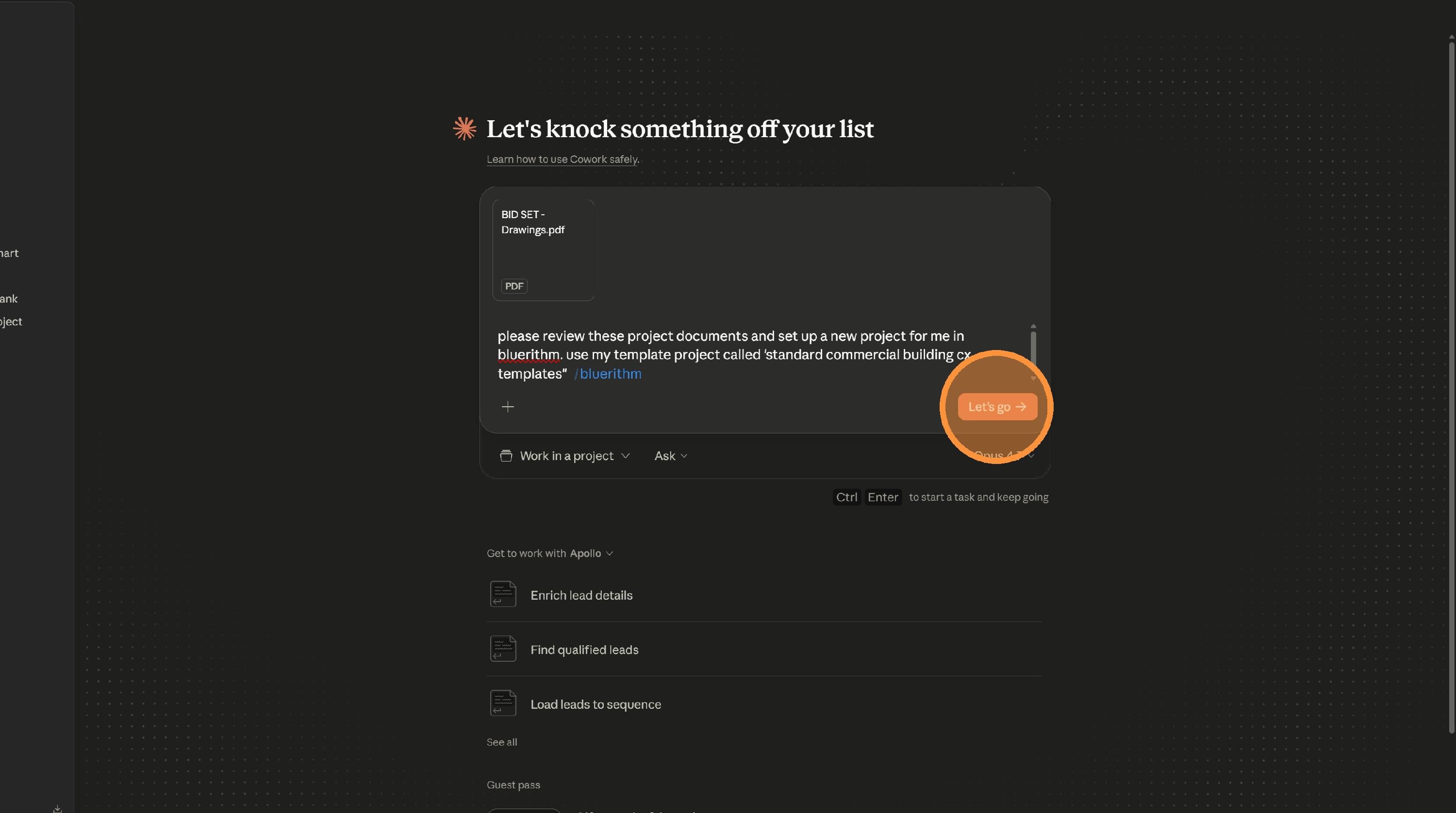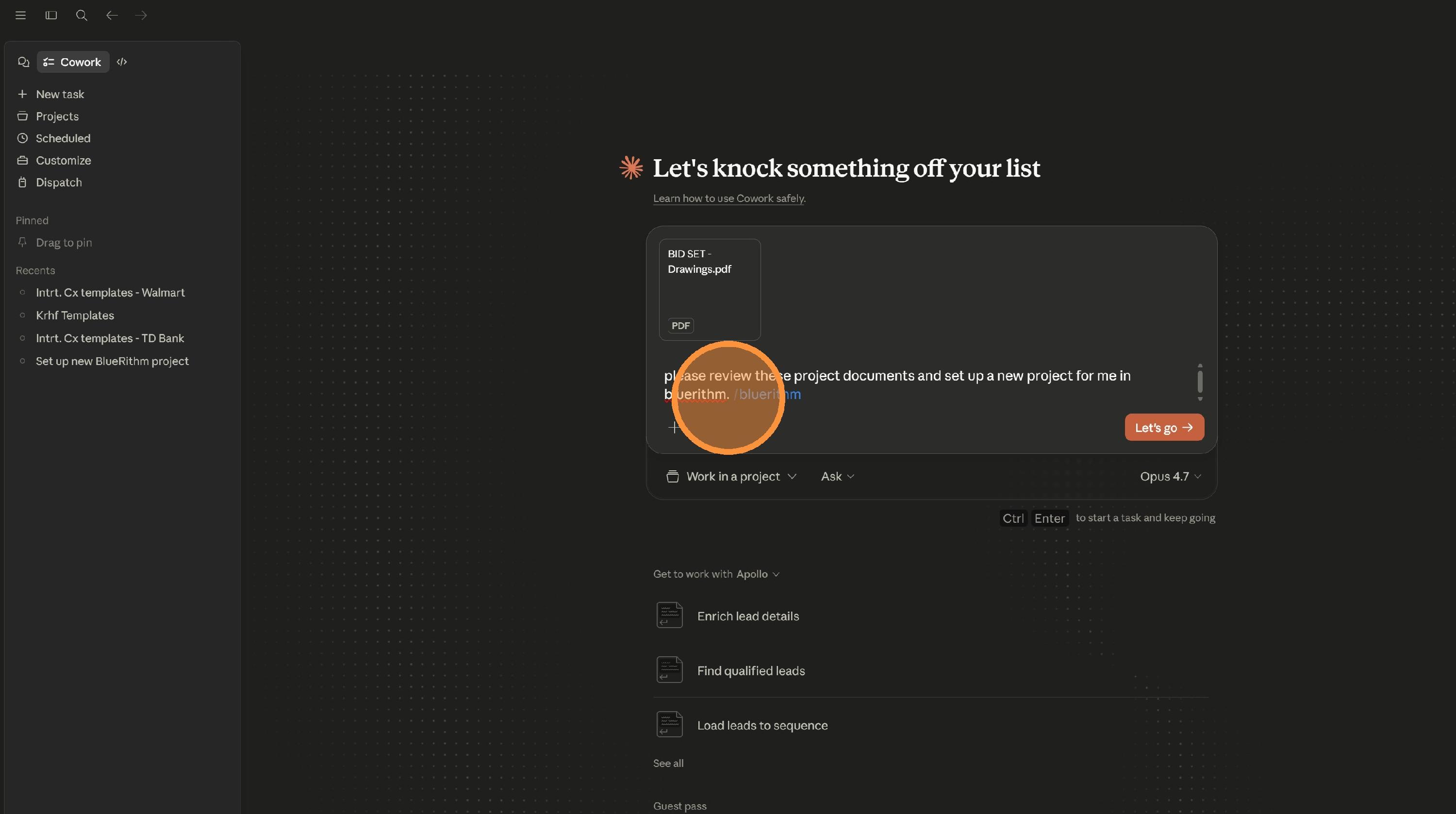 Follow this guide to install the Bluerithm plugin in Claude Cowork and connect it to your Bluerithm account. Once set up, you can hand Cowork your project documents and have it build out projects in Bluerithm for you.